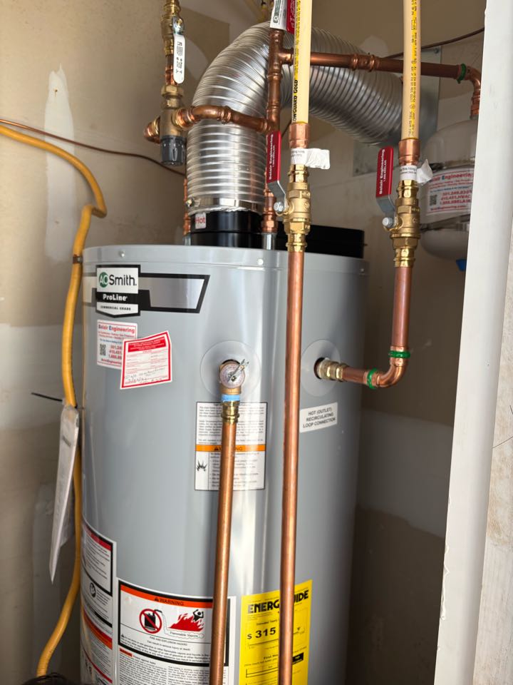 AO Smith natural gas hot water heater with exhaust vent and mixing valve installation service repair in Edgewater, MD 21037