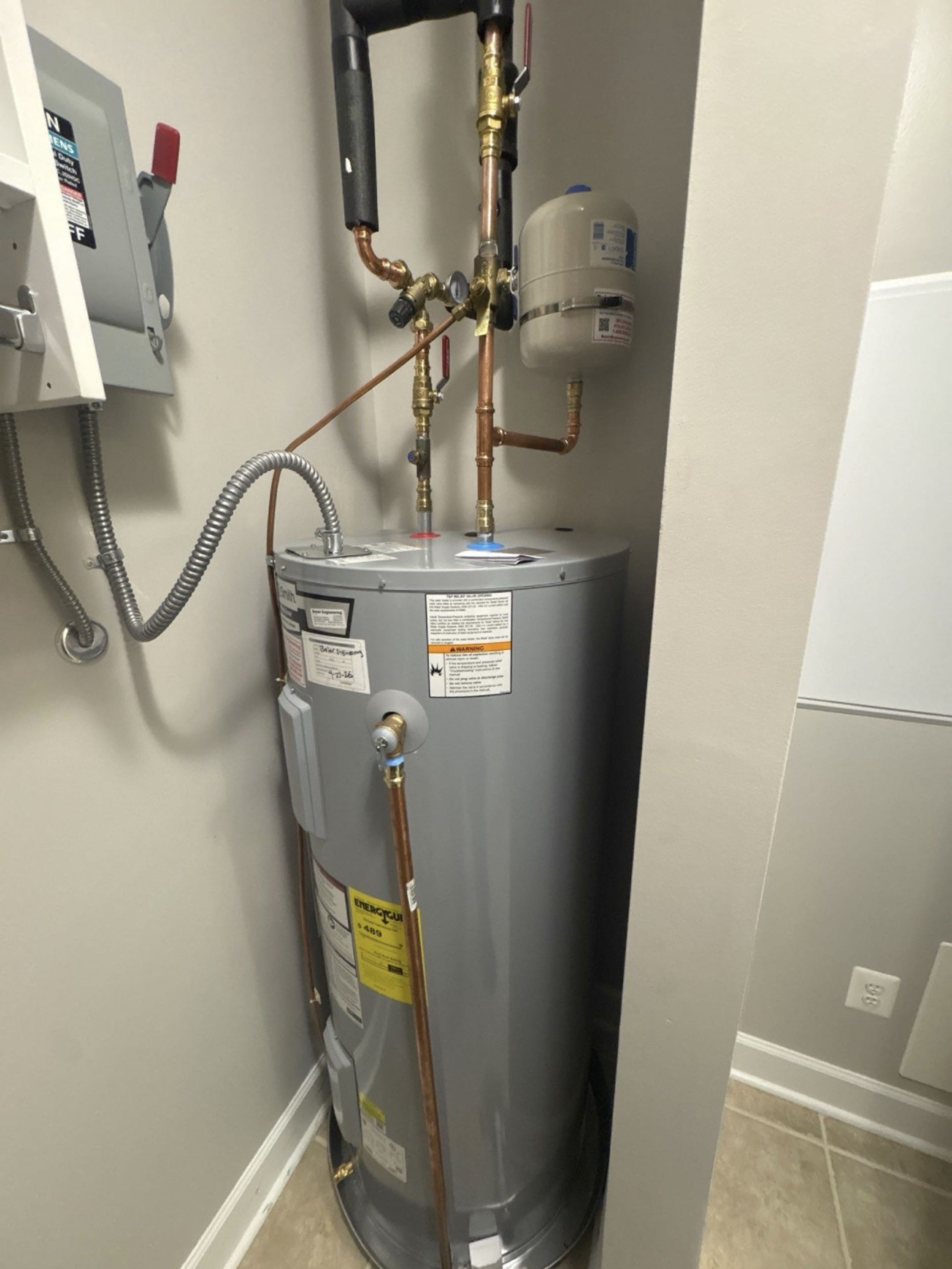 AO Smith 50 gallon hot water heater installation repair service mixing valve and breaker panel replacement in Annapolis, MD